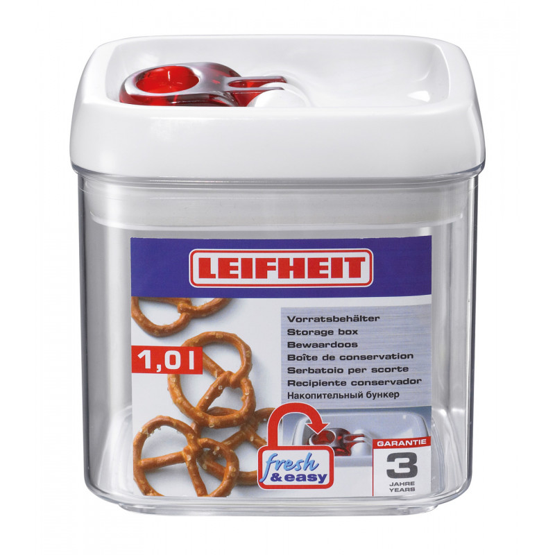 Open and close tightly with just one hand: these are the convenient fresh & easy storage containers from Leifheit. They are recognisable by the elegant design and the red ring of the patented one-handed operation. To open, simply raise up the ring. To close, attach the lid, fold down the ring and everything is already air and water-tight. fresh & easy storage containers are easy to stack thanks to their square shape. In this way, they save space in the cupboard and create order. Capacity of 1,000 ml. The decorative containers are available in four other sizes: 400 ml, 800 ml, 1,200 ml and 1,600 ml.