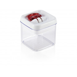 Opening and closing with only one hand: these are the practical storage containers fresh & easy from Leifheit. They are discernible by their elegant design and the red ring of the patented one hand operation. For the opening simply fold up the ring. For the closing put on the lid, fold down the ring and everything is closed air and water tight. Due to their square shape the fresh & easy storage containers are easy to stack. They save space in the cupboard and in the storage room and tidy things up. Volume 400ml. Available are the decorative containers in four further sizes: 800ml, 1.000ml, 1.200ml and 1.600ml.