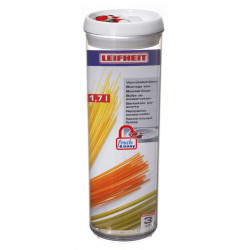 Open and close tightly with just one hand: these are the convenient fresh & easy storage containers from Leifheit. They are recognisable by the elegant design and the red ring of the patented one-handed operation. To open, simply raise up the ring. To close, attach the lid, fold down the ring and everything is already air and water-tight. fresh & easy storage containers are easy to stack thanks to their round shape. In this way, they save space in the cupboard and create order. Capacity of 1,700 ml. The decorative containers are available in six other sizes: 400 ml, 750 ml, 900 ml, 1,100 ml, 1,400 ml and 2,000 ml.