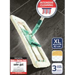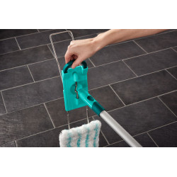 The end of back pain and unpleasant smears: Leifheit Profi micro duo removes with its special 2-fibre wiper cover even persistent dirt and can comfortably be operated by foot. This is the way the ideal floor wiper for large areas like kitchens or office rooms looks like. The 2-fibre wiper cover is made of the proven Leifheit micro fibre Duo. Numbers of finest bristles, which stick out a little bit, reach the smallest hollows and remove even persistent dirt without effort. With its imposing wiping width of 42 cm the Profi micro duo saves many working steps and valuable time. The ingenious flexible 360° rotating joint enables the efficient cleaning in wavy lines and revolves around table- and armoire-legs. The handle can completely be bent flat for even hard to reach areas like those under armoires and beds. The floor wiper can comfortably be operated while standing: simply remove the wiper cover by a foot click, press it in the separately available Leifheit Mop press, insert it again, ready.