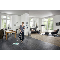 Goodbye ugly streaks - with the Leifheit Profi Floor Wiper for intense cleaning of smooth floors. The Leifheit Profi micro duo even removes stubborn dirt and cleans the baseboards at the same time with its special double fibre wrap-around cover. The wiping cover is made from the reliable Leifheit Microfibre Duo. Rows of tiny, slight raised brushes reach into the smallest recesses and effortlessly remove stubborn dirt. With its sizable wiping width of 42cm, the Profi Micro Duo makes fast work of cleaning even the largest surface. The ingenious, all-round flexible 360° Profi rotating joint enables effective cleaning in wavy lines and effortless cleaning around table and cabinet legs, while its completely flexible handle enables easy cleaning of hard-to-reach areas under cabinets and beds. The floor wiper is very comfortable to use while standing: simply release the wiper cover by pushing on the foot-operated button, wring it out in the Leifheit wiper cover Profi Press, which is available separately, clamp the cover back on, job done.
