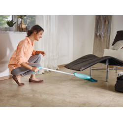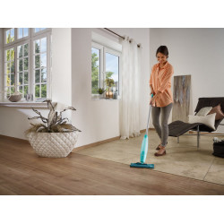Floor wiper Pico Spray offers a special cleaning comfort: besides scrubbing brush and wiper cloth is has also the “water bucket” ready for use at the same time. Pico Spray has a removable and refillable water tank on the handle. The tank is operated on the handle. Simply press the lever and the Pico Spray sprays clear water in a fine jet or an individually mixed cleaning agent. Pico Spray is the ideal wiper for the quick cleanliness in between. A comparison with other spray wipers shows its whole ability. Other wipers work only with the weight of the water. Pico Spray has a pressure system. With all its strength it sprays even bent flat up to the last drips of the tank volume. The fine cleaning film is also suitable for moisture-sensitive floors. Pico Spray can spray about 400 times before the 0,8 l tank has to be refilled. Concerning flexibility it offers also the typical Leifheit comfort: the agile wiper head takes out the dirt under shelves, makes itself flat under the bed and wipes thoroughly in every corner and on every step. The high quality Micro-Tech wiper cloth is washable up to 100 times. Wiping width is 26 cm.