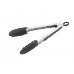 The Leifheit kitchen and grill tongs is ideal for the precise holding and safe turning. Whether as spatula, bread or pasta holder – the sturdy tongs made of stainless steel with its fluted holding surface has steaks under control as well as spaghetti. Thanks to the silicone coating the tongs can also be used in Teflon coated pans, without scratching the sensitive non-stick coating. For the space saving storing the tongs can be locked. It has an eyelet for hanging and is therefore always ready to hand. Length 23cm.