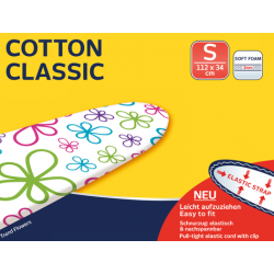 Your mood will improve all the more while you iron: even ironing is fun thanks to the fresh spring colourful designs on the Cotton Classic S ironing cover. The 3 mm thick foam padding ensures real ironing comfort. It makes ironing easier and protects laundry - without additional fleece. With its elastic drawstring, the Cotton Classic S is quick and simple to put on. To ensure the cover doesn't slip and sits taut every time, it can be tightened quickly and simply using the tension clip. Padding and cover are Eco-Tex certified for quality and are eco-friendly.. Fits ironing boards up to a maximum size of 112 x 34 cm. Also excellent for steam irons and steam generators.