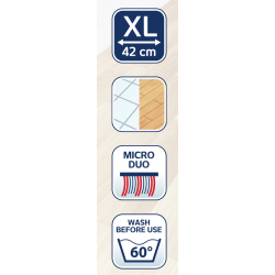 From now on even grease and finest dirt have no chance. Leifheit wiper cover Profi micro duo offers the double cleaning power due to its special bristles. The special bristles stick out a little bit and take the dirt out of every gap. They reach every hollow in structured surfaces. The micro fibre absorbs the whole dirt and water due to its fine fibres and large surface. The wiper cover Profi micro duo is washable at 60°C and does not loose its cleaning power even after repeated washings. It is suitable for all smooth floors, whether stone, parquet or laminate. The suitable wiping system is Leifheit floor wiper Profi, which can be operated by foot without bending down.