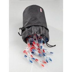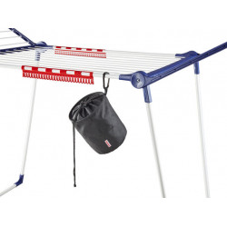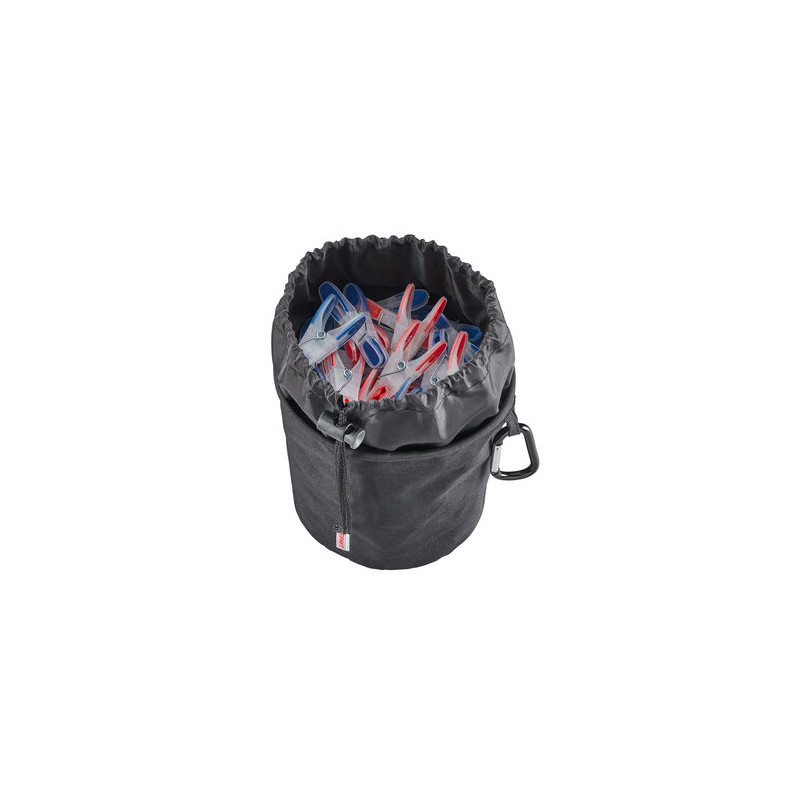 With the practical clothes peg bag from Leifheit's range, housework is done much faster. Pegs are easily stored away and are quickly at hand, ready for use. This means that the laundry is hung out effortlessly and quickly on the washing line. The bag is of particularly high quality thanks to the tightly woven fabric. The material protects the clothes pegs from environmental influences such as rain because it keeps out moisture. If rainwater does get into the bag, it does not remain thanks to the water-permeable bottom. This means that there is no chance of corrosion and the metal parts on the pegs do not rust. Its large capacity is highly practical: The clothes peg bag offers space for up to 100 clothes pegs. Thanks to the sturdy carabiner hook, it can be easily attached to the rotary clothes dryer, laundry rack or belt loop. This ensures that the pegs are always available. Another advantage of the clothes pegs bag is its large opening at the top, which means pegs can be easily grasped and taken out or returned. Its useful drawstring fastener makes for practical opening and secure closing. This protects the contents of the Leifheit clothes peg bag from dust and dirt.