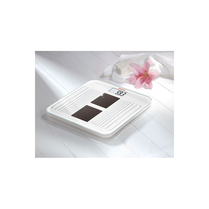 With the digital solar scale “Solar Star“ you can start your personal energy transformation. It works completely without batteries and therefore protects the environment as well as your wallet. The extremely powerful solar technology guarantees reliable operation even under low light conditions – with artificial light as well as daylight. “Solar Star” is a perfect combination of functionality and technology; optically it is an absolute highlight. Perfection right down to the last detail is its strength. Digits that are particularly easy-to-read on the large LCD screen display the body weight, which, due to the integrated Soehnle 4 sensor technology, is always measured with high weighing precision in a graduation to 100 gram precise. With excellent stability on the large platform made of safety glass, it offers high load capacity for persons up to 150 kg. It persuades with simple elegance, linear design, and aesthetics.