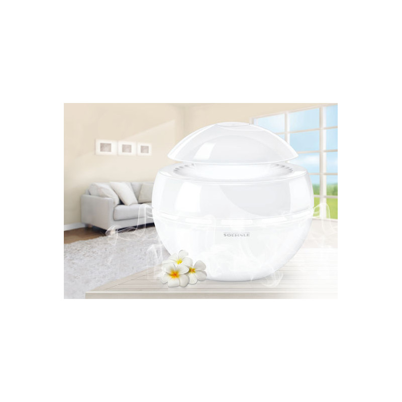 Say goodbye to dry air indoors! With the new Design Air Humidifier Airfresh, you will have a fresh feeling of wellness and wellbeing indoors all year long. The innovative ultrasonic technology with an evaporation rate of approx. 125 ml per hour ensures an even 360° air humidification. Due to the tank volume of 800 ml water, Airfresh provides optimum air humidification for rooms of up to 25 m2 and up to 6 hours. If desired, the additional, white LED light will add a magical light effect to your room, calms the eyes as well as the nerves, and ensures a sensual, soft atmosphere. Airfresh Air Humidifiers are also particularly suitable for room fragrance with Soehnle fragrance oils. Easy to operate due to the toggle switch integrated into the cover and tested for state-of-the-art safety by TÜV SÜD.