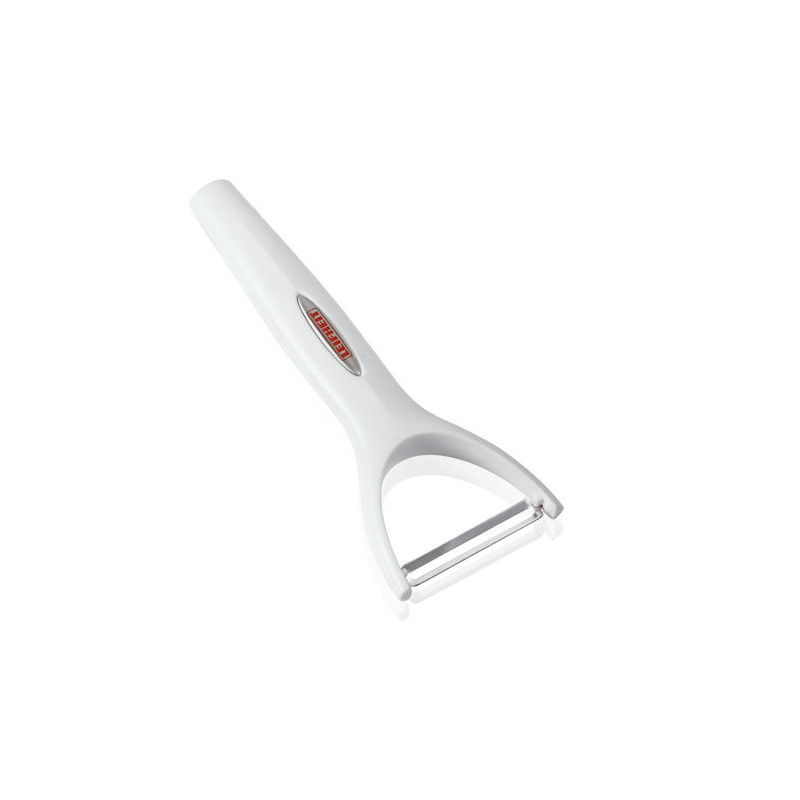The Leifheit kitchen helpers with the comfort handle. The two-zone handle of the Y-peeler is made of two plastics, which complement each other excellently. The white plastic enables stability, cleanliness and hygiene. The soft zones in trendy red are there, where power reacts while using and the particular non-slipping is important. They prevent from slipping even with wet hands and offer a pleasant grip feeling. With practical eyelet for hanging for the separately available ComfortLine hook rail.