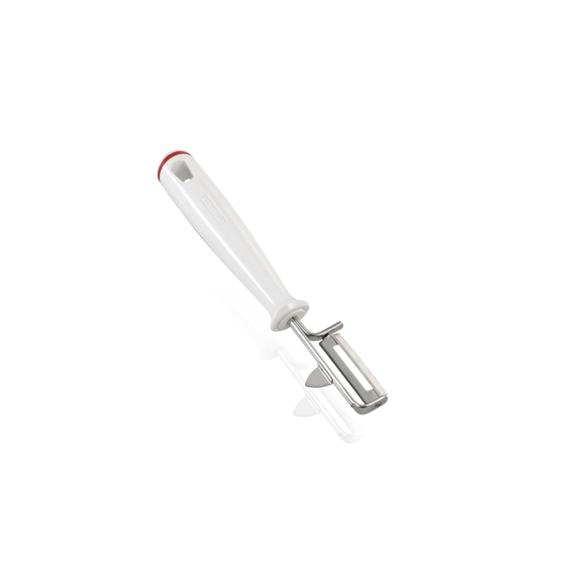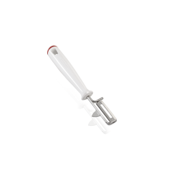 The Leifheit kitchen helpers with the comfort handle. The two-zone handle of the Y-peeler is made of two plastics, which complement each other excellently. The white plastic enables stability, cleanliness and hygiene. The soft zones in trendy red are there, where power reacts while using and the particular non-slipping is important. They prevent from slipping even with wet hands and offer a pleasant grip feeling. With practical eyelet for hanging for the separately available ComfortLine hook rail.