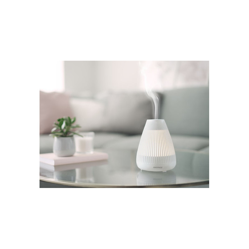Aroma Diffuser Bari creează o atmosferă relaxanta în orice cameră care te lasă să te simți bine. Parfumul este distribuit uniform în întreaga cameră, datorită unui mister modern cu ultrasunete. Folosind diferite parfumuri esențiale sau uleiuri parfumate, puteți adapta individual atât direcția parfumului, cât și intensitatea acestuia în totalitate la cerințele dvs. personale. Eliberarea parfumului a Soehnle Aroma Diffuser poate fi controlată și în două intervale liniștite de parfumare - în intervale de 10 secunde sau în mod constant. O lumină LED conectabilă, albă, oferă un efect de iluminare magic camerei și oferă o ambianță senzuală. Rezervorul de apă încorporat vă oferă camere de parfumuri optime de până la 16 m² pentru aproximativ. 3,5 ore. Dacă rezervorul de apă rămâne gol, dispozitivul se oprește automat. Efectul aromatic al diferitelor uleiuri de parfum Soehnle le face deosebit de potrivite pentru utilizarea în Design Aroma Diffuser Bari.