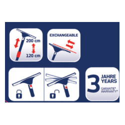 Se poate folosi cu manerul telescopic inclus, ce poate fi extins de la 1,2 m la 2 m sau cu alte cozi Leifheit Click - System.